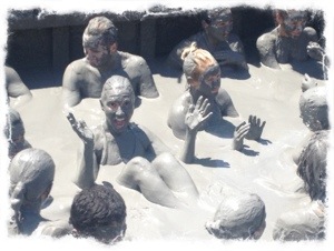 When we arrived at the volcano, they had us strip to our swimsuits and start climbing up the short set of steep stairs to the top. It is really not a big volcano, but it is unique because it is filled with over 200 meters of cool mud. At the top, they have wooden stairs into the volcano and you climb into the muddy pool while being pulled by a local masseuse who lays you on the surface and starts covering you with the mud. No matter what you do, you cannot sink in this thick, oozy mud…in fact it is hard to move anywhere, so the tug of the masseuse is helpful… even if you really don’t get a massage but more of a mud covering. Once I was covered, I sat socializing with our group and watching everyone “enjoy” the fun. I had mud on my teeth that I was too covered to rub off, so I just had to suck it up and swallow it. If I lifted my arms and stood really still, I feel like one of those bodies that were preserved at Pompeii, so I just enjoyed making silly poses for a while. At the end, I worked my way back to the ladder to be pulled up and to have globs of mind scraped off of me. The next stop was a walk to the nearby lake to be cleaned off. A few women grabbed me…for a promised small fee, and covered my head with buckets of water and rubbed the mud off of me as I sat in the shallow water. I was a bit surprised…shocked…when she undid my swim top and rinsed it out while I laid modestly under the water. When she demanded my bottoms, I handed them over for the same treatment.