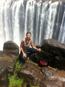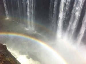 Victoria Falls is the largest in the world. The power of the water was intimidating. As I walked along the nearby path, the sound of the Falls was vibrant and the water poured over me like rain. I got soaked as I walked and stopped at each viewing spot. The most surprising thing to me was that there were no fences…no safety measures at all on the slippery rocks above the Falls. As I sat on the rocks, I was scared…scared that one clumsy slip would send me over the edge. I was just inches from the plunge,