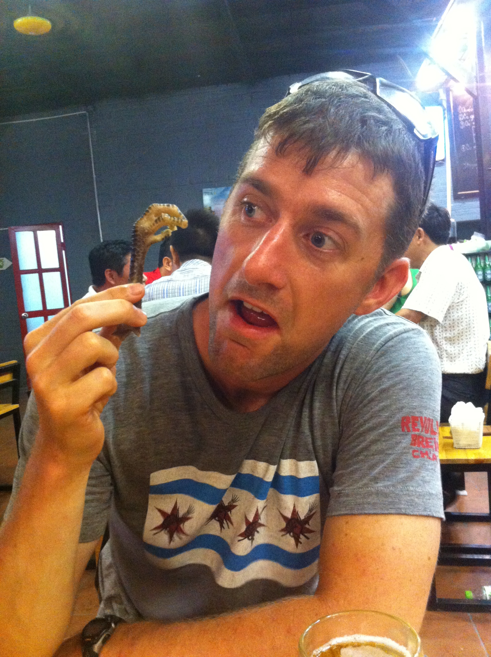 So – as we sat at that table, I couldn’t help but think, “Well played, Dave,” as the monk opened his wide smile and proudly hoisted three big cubes of pig onto my rice and waited for my reaction. Jason’s plate was next. Again…the eye contact communication…and a clear understanding that we were BOTH eating it. Who says no to a kindhearted monk who welcomed strangers to celebrate with his village? Dave won as one, two, three cubes exploded in my mouth and slid down my throat. YUM?