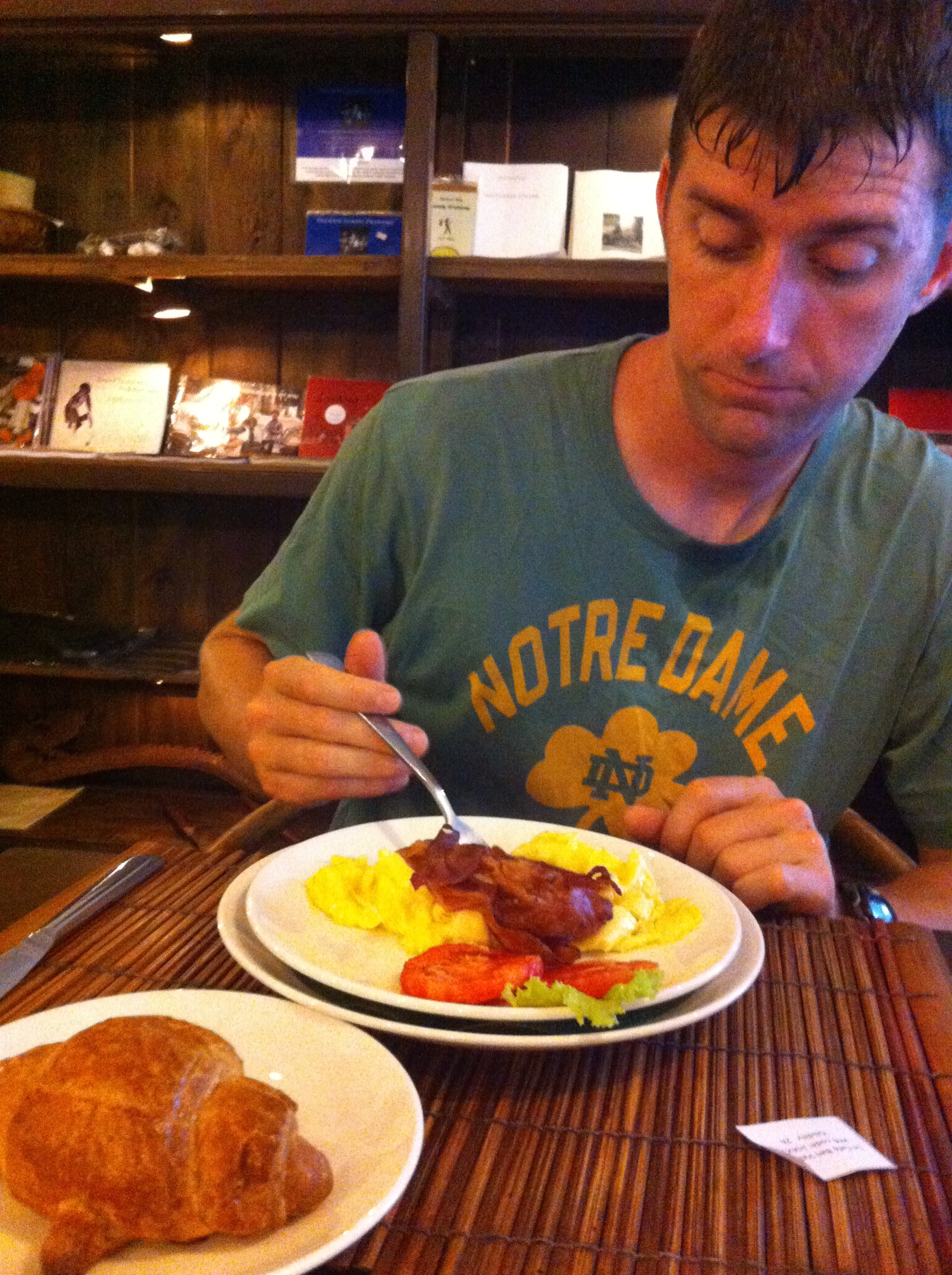 Sapa, Vietnam was dreamy. Riding through the rice fields, mountains, and even the clouds is the reason I’m glad I gave up the motorbike bias because of the opportunities to see the smallest parts of nearby villages. Stopping on the side of the road at a makeshift fire pit grill for corn, potatoes, and bamboo rice provided the perfect warmth for another otherwise cool and rainy day. At this point, I was sniffling a bit and feeling congested. While I tried to keep it to myself, Jason soon found himself in the same boat – but much worse – “ravaged” with a sour stomach, headache, and more…all while enjoying at least one 20 hour bus trip from Sapa to Laos. Okay…in the spirit of full disclosure, I made fun of him saying he was “ravaged” and didn’t really have much empathy. While looking at pictures for this blog post, I spotted this one, and a sense of guilt welled in my heart. Sweaty, pale, and thin…I think he really was pretty sick.
