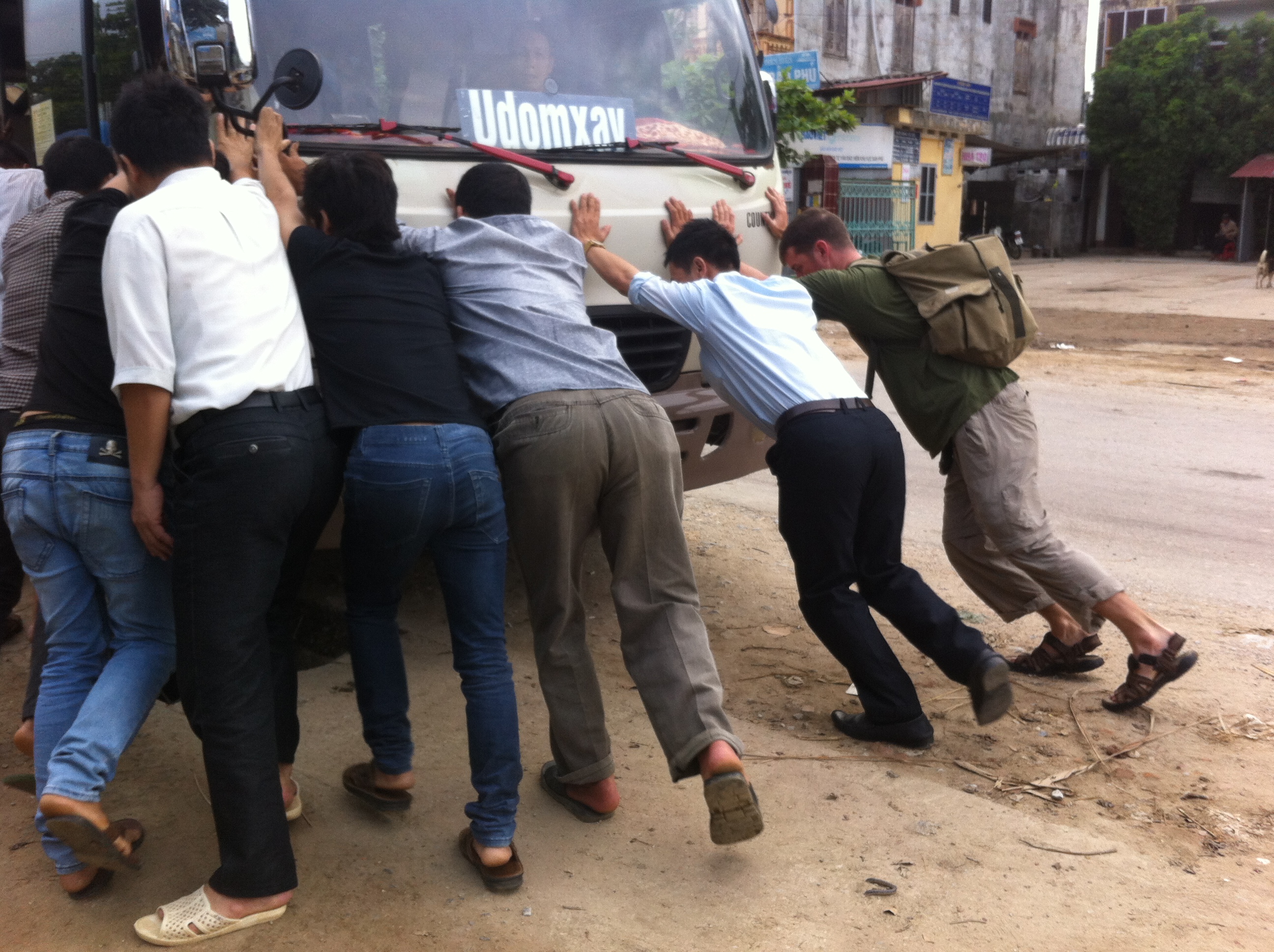 The trip to Laos started with the overnight bus, continued with a border stop and switched to a smaller van. As we sat on the van, with two others who quickly became our friends, our seats and aisle were quickly filled with bags of rice, appliances, boxes, and a few mini chicks who were quacking from their seats on the roof of the van. With a big bump, one of our van tires took a dive into a small roadside hole. We all climbed over the stuff, took a peek, and watched the bus driver and male passengers push the van out of the hole. Me…I took pictures.