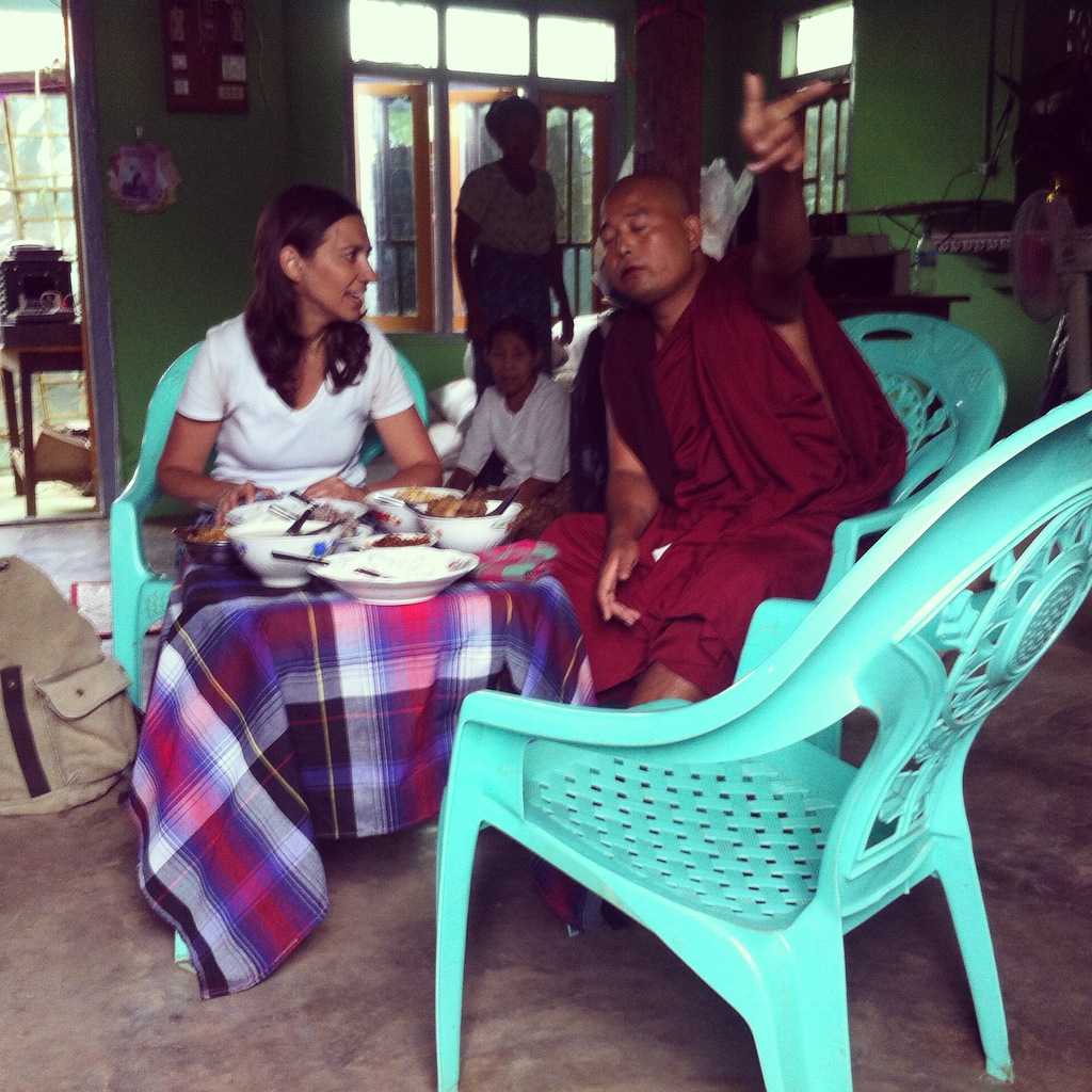 We were led into a home where a table was pre-set with about 15 small bowls filled with the same food we saw outside – along with bowls of meat. Not just any meat – but a bowl filled with pork – well I’ll say pig – because you could see small cubes of skin lining an inch of gelatinous fat with a thin layer of meat below. As we enjoyed the food and tried to learn about the reasons for the festivities, I blended all of the food items together – Burmese style including the herbs and spice mixes provided – while avoiding the meat. We ate and chatted and the monk showed us a tall stack of dollars as the English speaking girl used Google translate and showed us the word Philanthropist and pointed to a picture of the couple who led the parade. It appeared that they hosted this event as a gift to the village, and I assumed the money was donated to the monk.