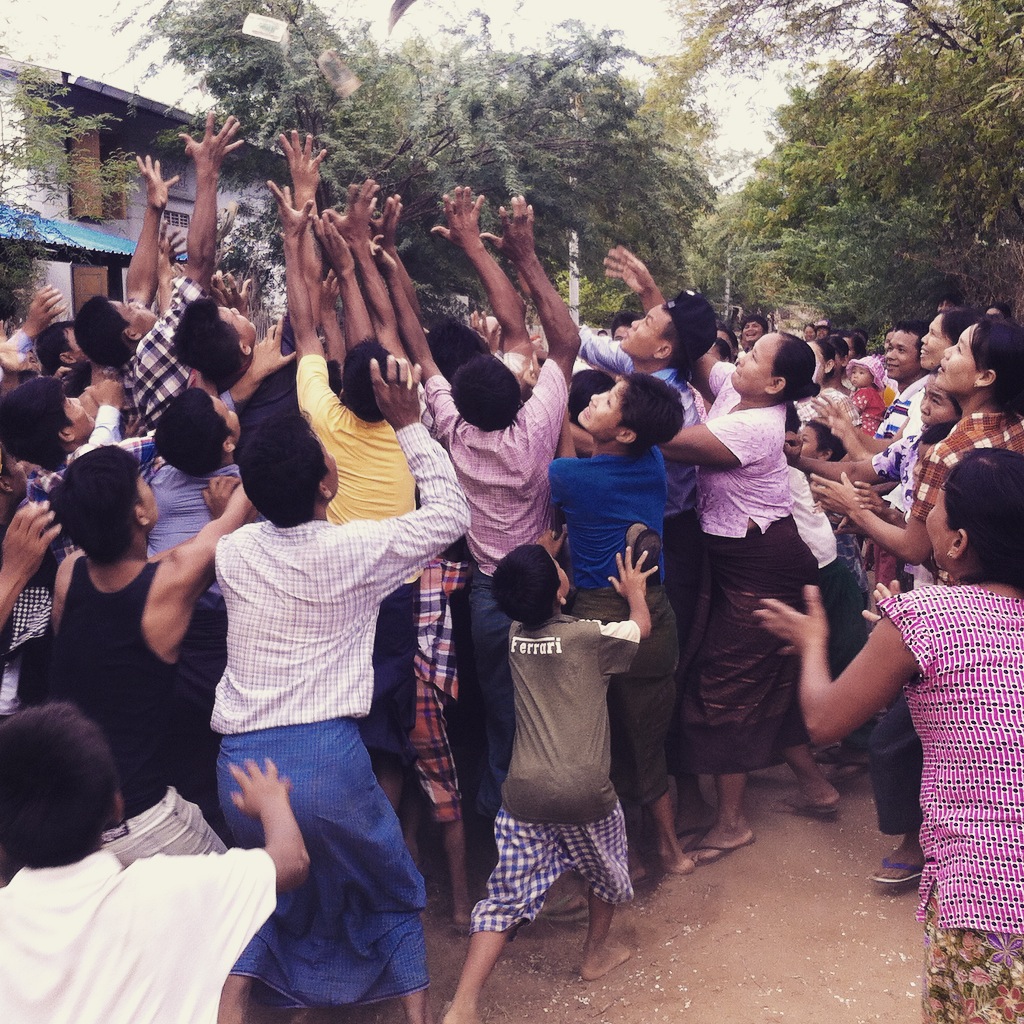 When we exited the house, we watched a spectacular scene as we learned that the stack of money wasn’t for the monks, but for the villagers. One monk friend gathered the people around him and began to separate small piles of money from the stack, throwing it high into the air for others to catch. It was chaos! It was exciting! It was even a bit dangerous as we watched a woman holding a baby fall onto the ground and into a puddle. This was definitely a once in a lifetime event that we won’t soon forget.