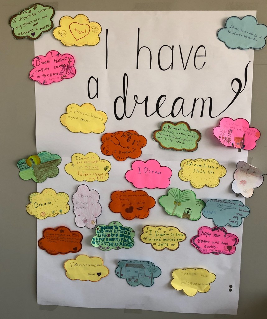 During the next week, collaboration sessions mirrored my favorite moments (with Colleen Walsh, of course) at school. Ideas flew as I worked with my Muna and Joy, my planning partners, to blend mental health outreach and art therapy activities within their weekly English and leadership lessons. They are committed to excellence – but also want to make sure that the sessions are fruitful and fun.