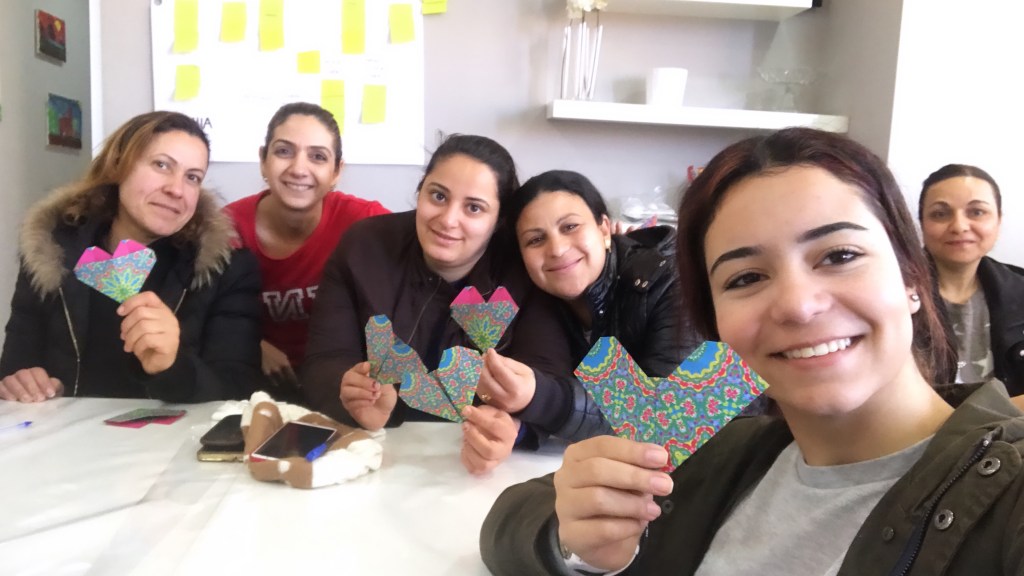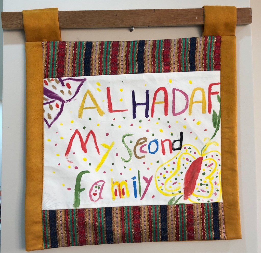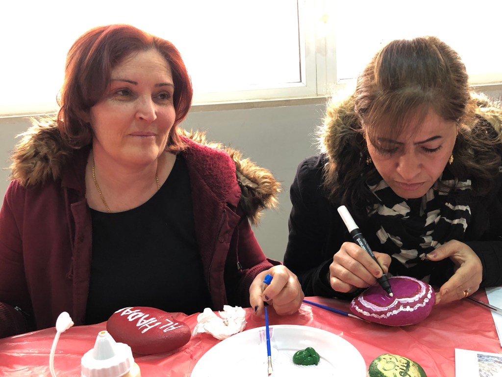 There was so much chatting as everyone painted – and lots of laughter. Women shared about their appreciation for the AlHadaf team and the value placed on their weekly time together to learn and grow. For some, art projects may seen juvenile or like time spent creating isn’t enough to address big issues. To me, artistic environments supports friendship and a small escape from routines.