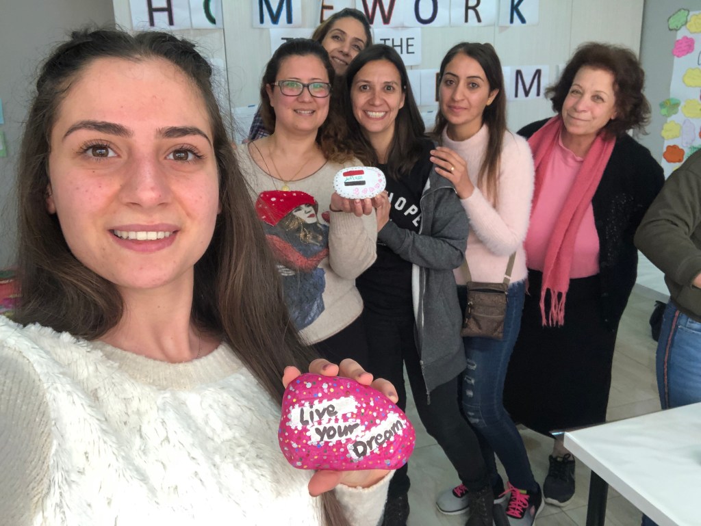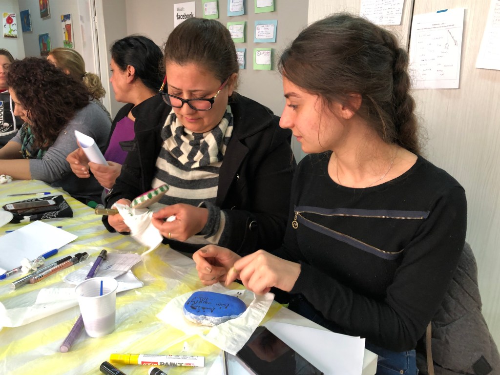 During each Kindness Rocks session – the classroom filled with women and children who are not only neighbors, but deeply connected by the shared experience of being Iraqi refugees forced to flee their homes due to threats from ISIS. Discussions about hope and change moved from influencing the world to also focusing on family relationships and personal self care.