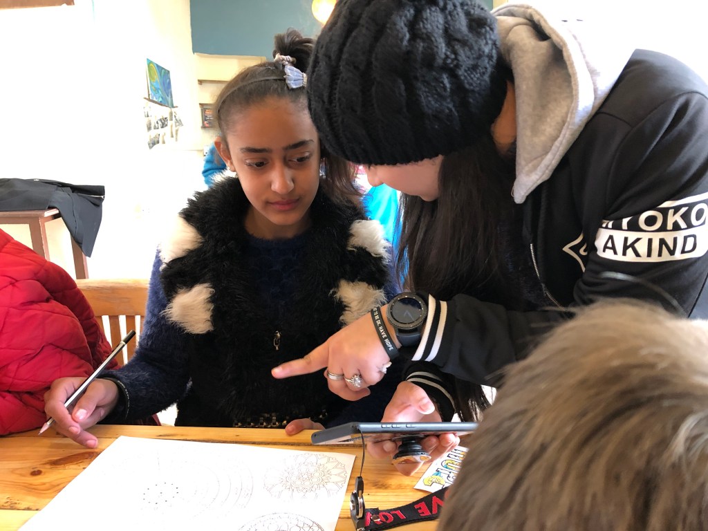 Our first session on mandala art was a bit rushed when the bus was late, but I personally loved the way Abeer created a template that made mandala patterns so easy to create. She has a wonderful style – guiding each child to create their own masterpiece – being both an encourager and teacher. She has a wonderful style – guiding each child to create their own masterpiece – being an encourager and teacher. I loved how she naturally leaned into each young artist and offered kindness with her gentle and genuine nature. Personally, I enjoyed the time spent creating. I never jumped on the coloring page bandwagon, but there was definite power in the peaceful mood of the repetitive patterned mandala designs.