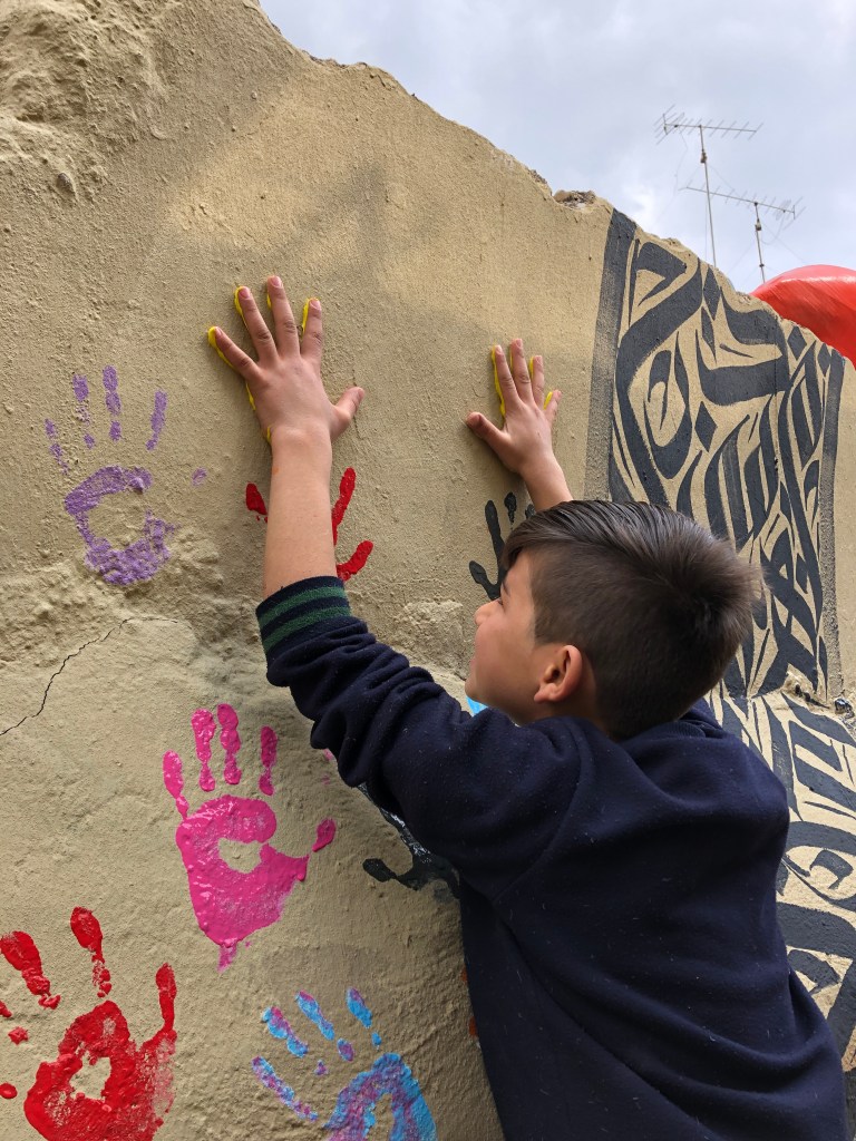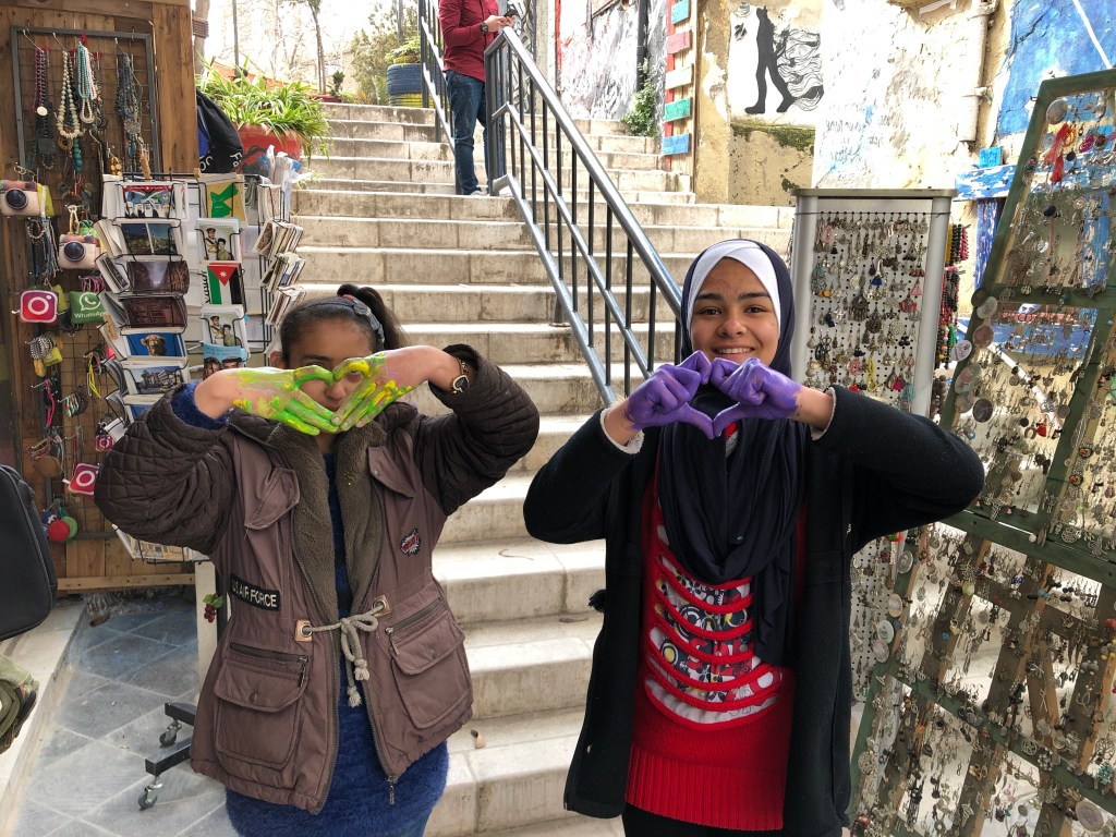 Our second session connected the power of self expression through art with the value of kindness. At first, there was a tad of disappointment when the wall Abeer wanted to paint was unavailable and we were given a long space above other completed murals. As our mural was intended to have interactive participation by the Jadal youth group, we had to quickly adjust our plans so they could have a step up while adding handprints to the mural space.