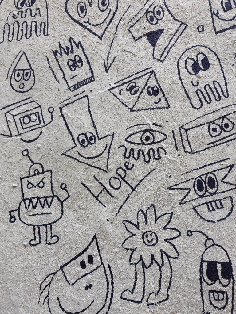 The mural design included three elements of community input blended together to show unity of purpose in hope. The center “Have Hope” message is surrounded by whimsical doodle creations by Abeer, Arabic calligraphy by Abd Alrahman, and children’s handprints decorated with positive messages. While each section is interesting by itself, the blend of styles is powerful when combined and stands out high above the Alkalha Steps.