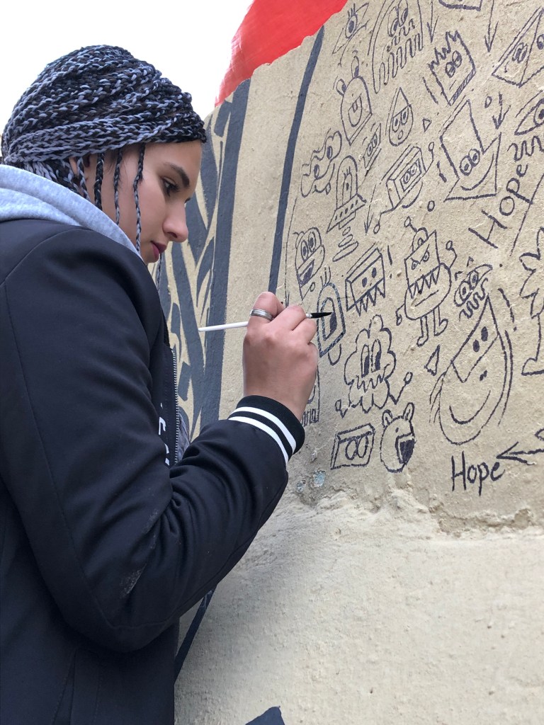 Abeer and Abd Alrhaman continued to work on the mural – with Abeer’s doodle portion lasting well into the evening. In spite of the dropping temps and strain of working on the high wall, Abeer maintained dedication to every detail – especially in her desire to leave handprint messages to surprise each child –