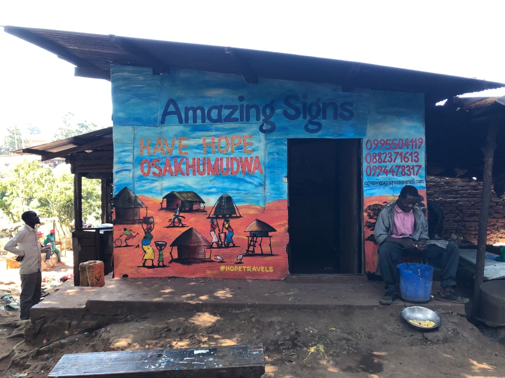 Of particular note to me was the high quality of their lettering – even though I saw it happen – it was hard to believe the perfect, decorative letters were done without a stencil and evolved from their steady hands. Messages of hope in English and Chewa will greet all visitors of Lizulu Market and proudly highlight the location of the “Amazing Signs” shop.