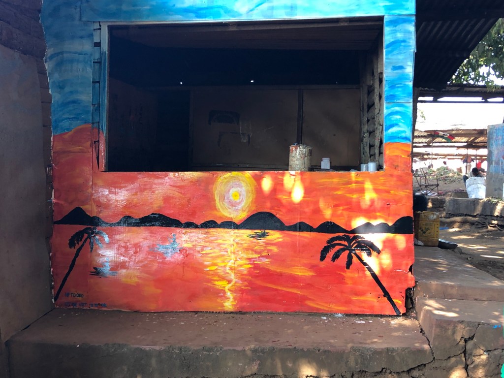 After a short detour with Respect to his home city near Lake Malawi, it was time to start painting. With paintbrushes in hands, Respect and his friend Max created a storefront that regally stands out in the market now. Bright colors draw the eyes to a stunning African village scene. At their work evolved, all eyes were on the store and many who passed stopped to compliment their work.